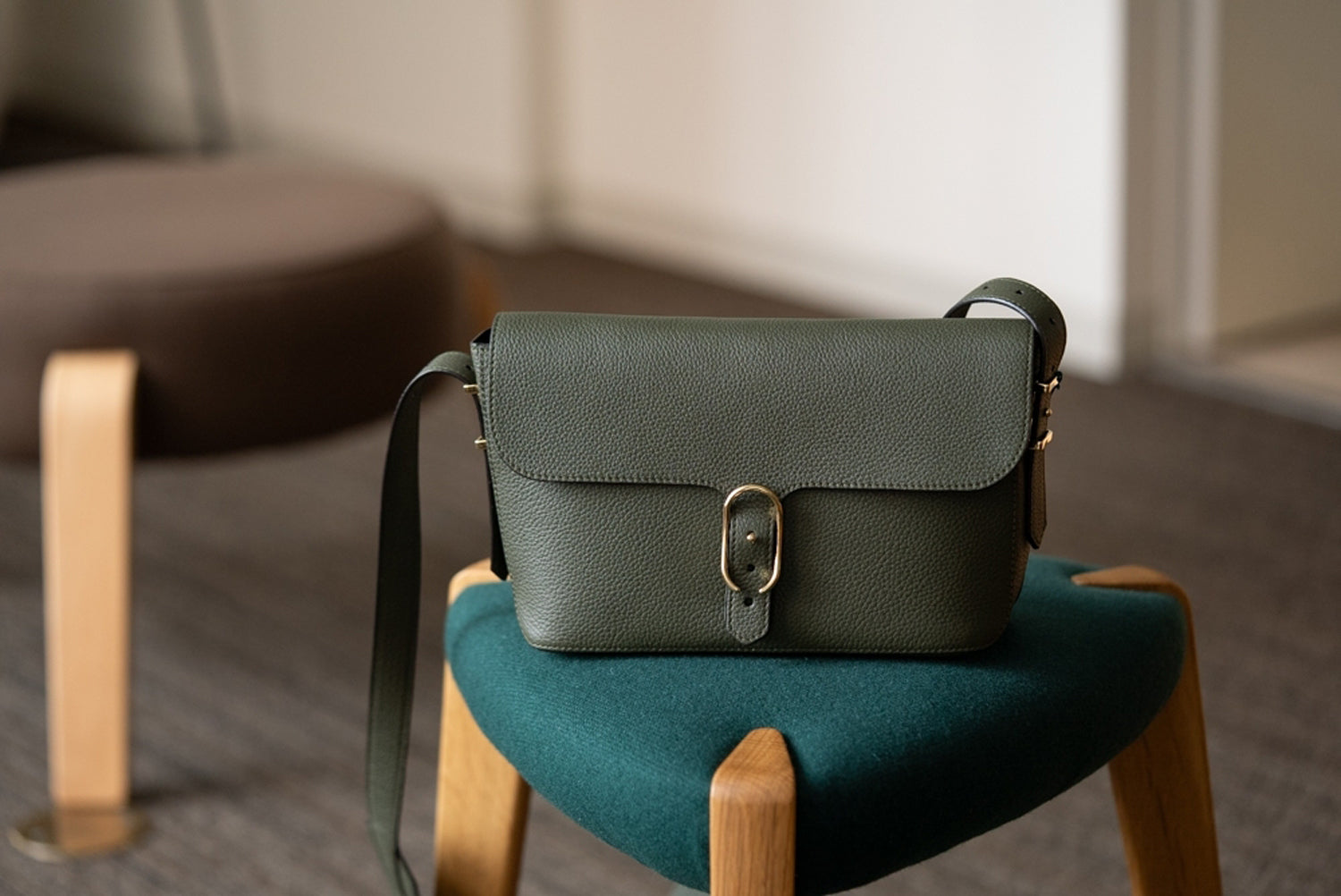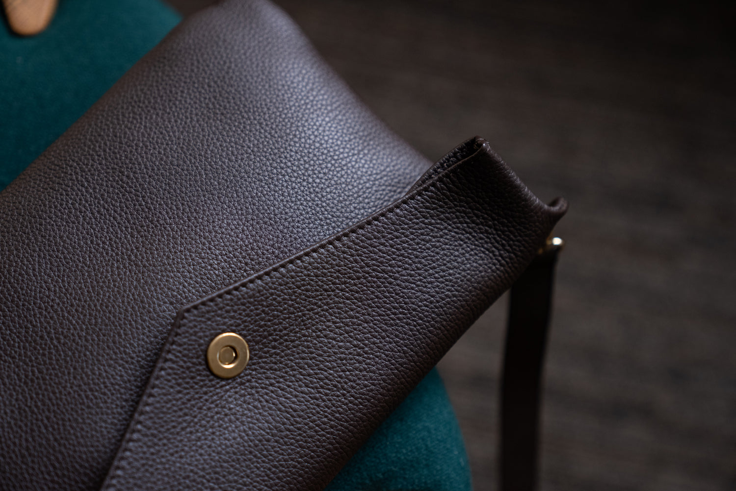 背面からつながる贅沢な1枚革で作られるフラップはこのモデルの大きな特徴です。