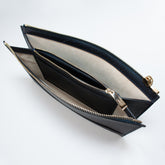 贅沢に裁断した2枚の革パーツから成形された、シンプルなデザインでありながら機能性に富んだクラッチバッグです。