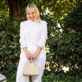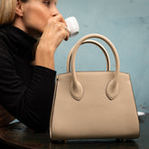豚革スウェード: 手触りはソフトで滑らか。高級感をより高めるとともに、表革との共縫い製法によりバッグの型崩れを防ぎます。 |
